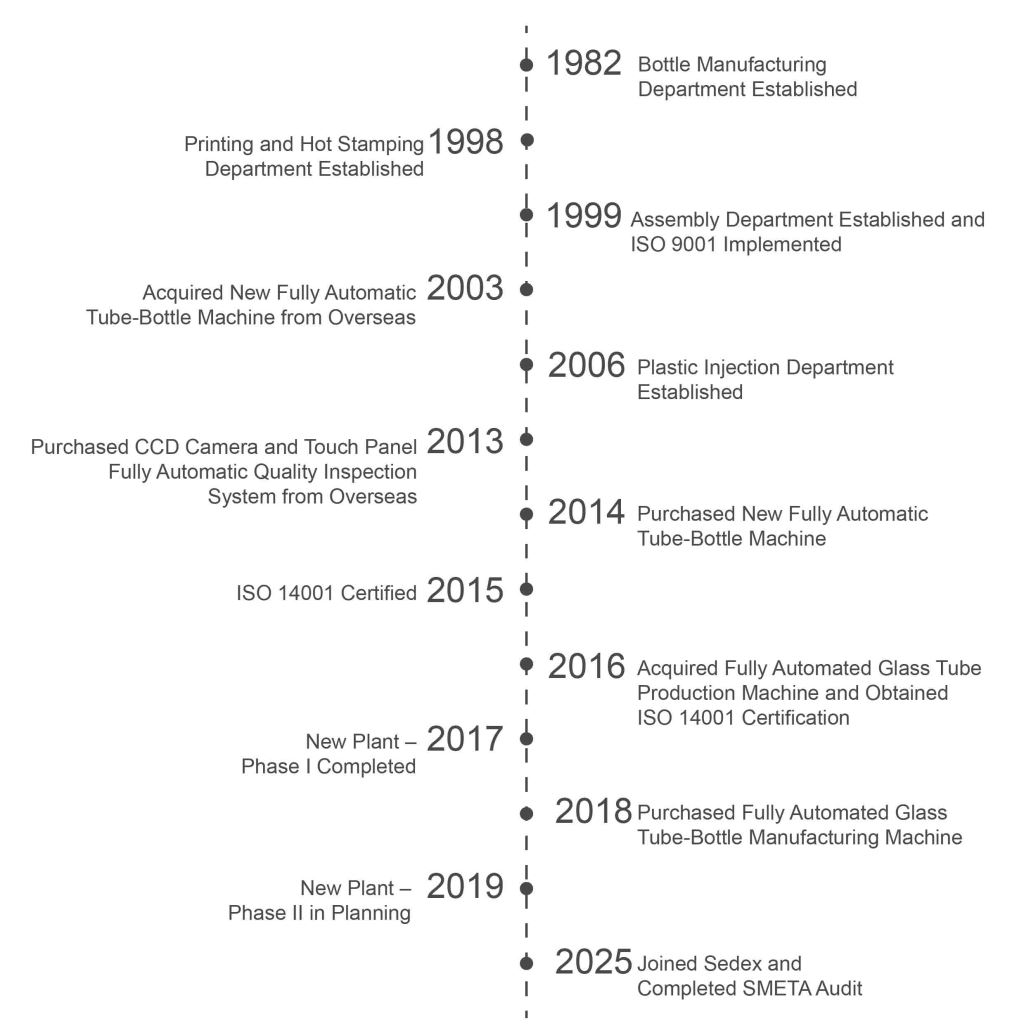 Over more than four decades of continuous research and development, we have successively established our bottle manufacturing, printing and hot stamping, and plastic injection departments.