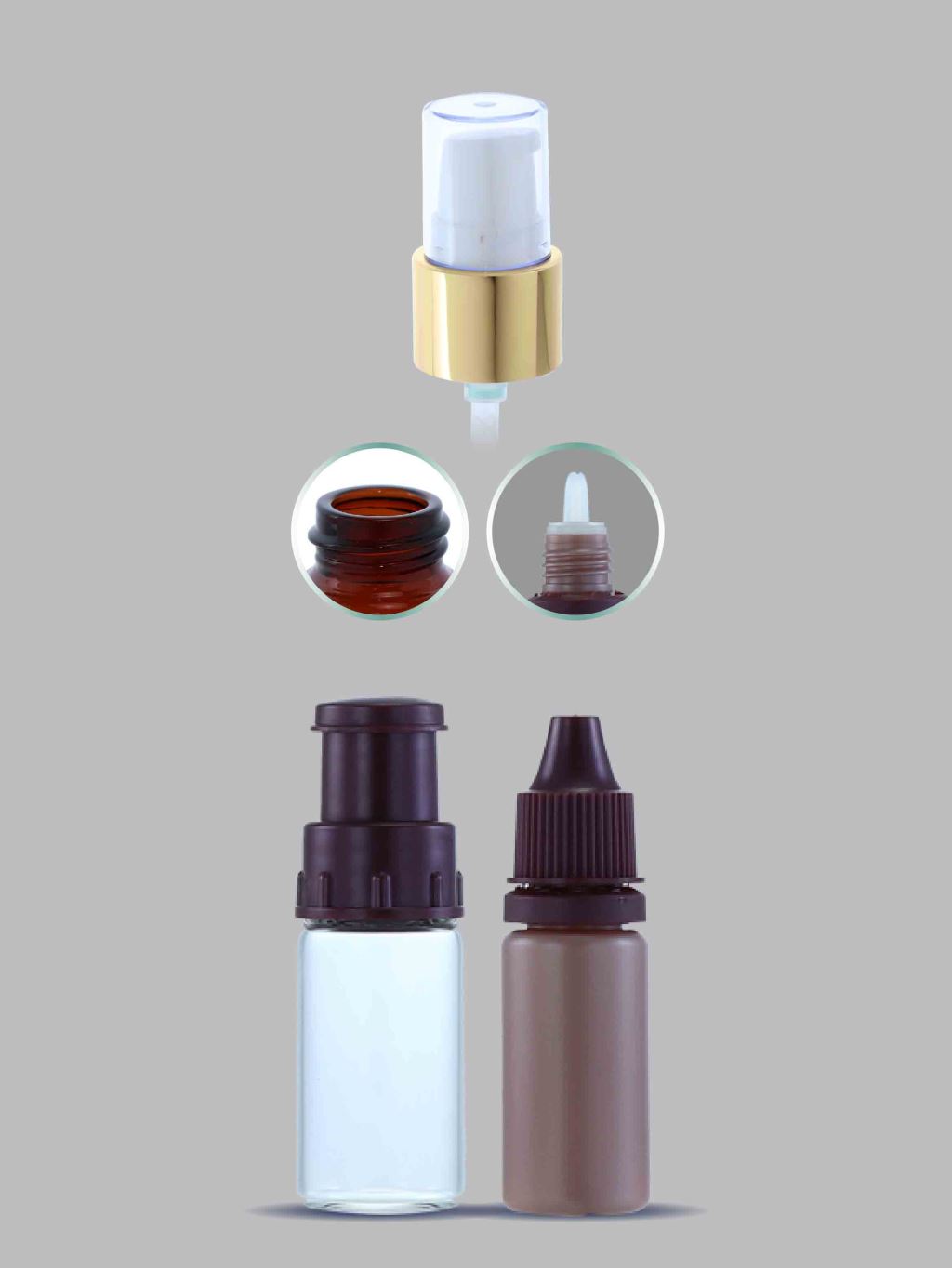 25*53 第二代子母牙瓶 + 第二代子母瓶 + 一般/凍晶內塞 + 塑膠白主體上蓋 + 塑膠白主體 + 10ml 白(本)色塑膠瓶 + 塑膠本色内塞 + 塑膠白上蓋( 選配 : 按紐 + 中束 + 透明上蓋(套亮金/亮銀鋁蓋)
